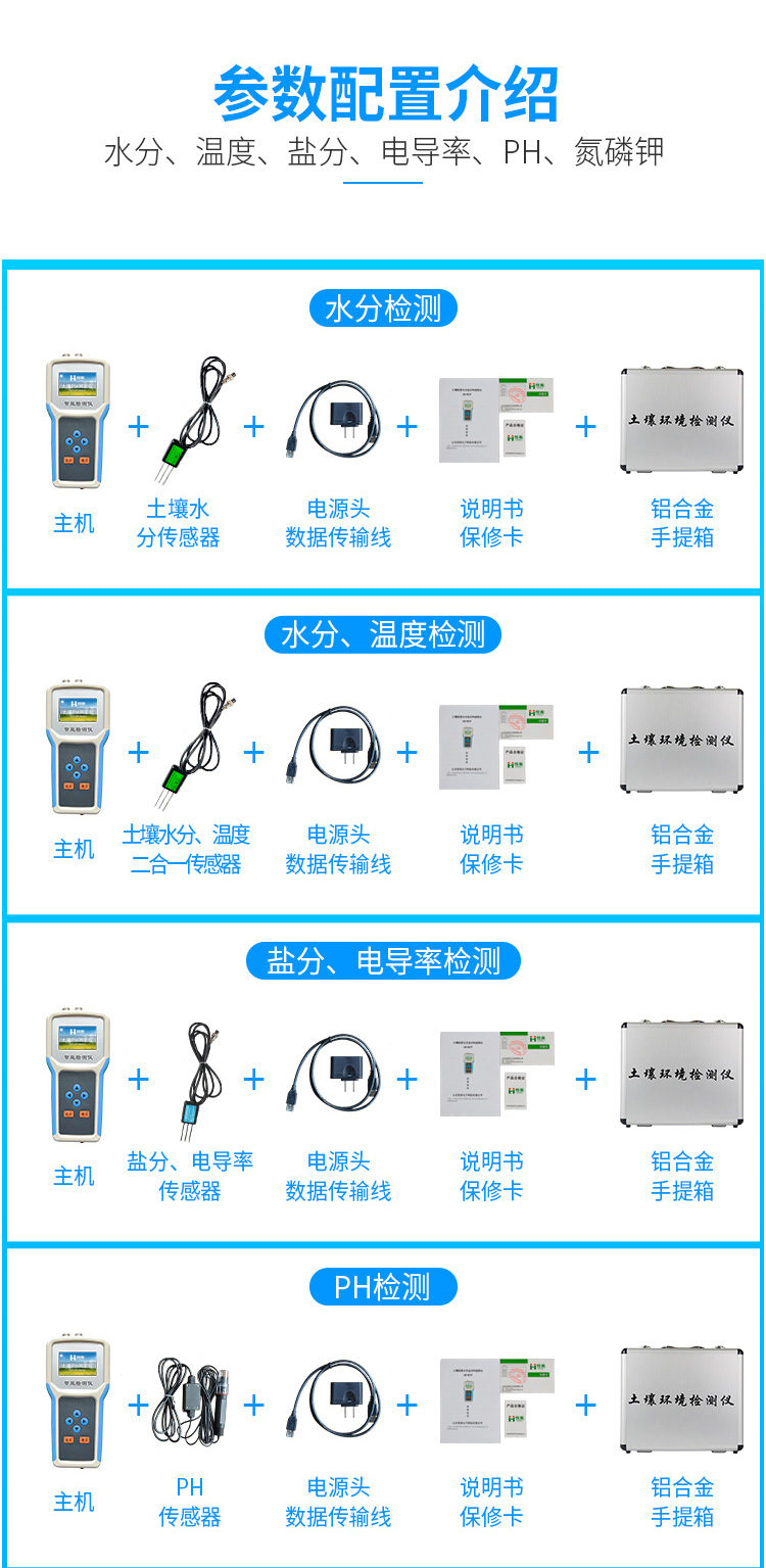 土壤PH測定儀采用一體化結構設計,外置SD卡,主機可以實時采集被測環境土壤的溫度、水分、鹽分、PH等多個參數,一鍵上傳數據等。